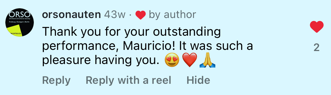 „Ich habe Mauricios Konzert während der Tour 2017 sehr genossen – eine sehr professionelle und präzise Darbietung, ein interessantes Repertoire und ein hervorragender Kontakt zum Publikum.“